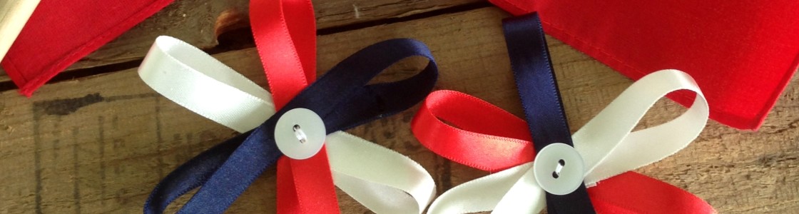 For Ä lage en rosett trenger du 20 cm med bÄnd i hver farge. Disse limes sammen i en ring. Da blir de lettere Ä holde sammen nÄr syingen starter. Fest de tre bÄndringene oppÄ hverandre ved hjelp av nÄl og trÄd, og sy fast knappen.