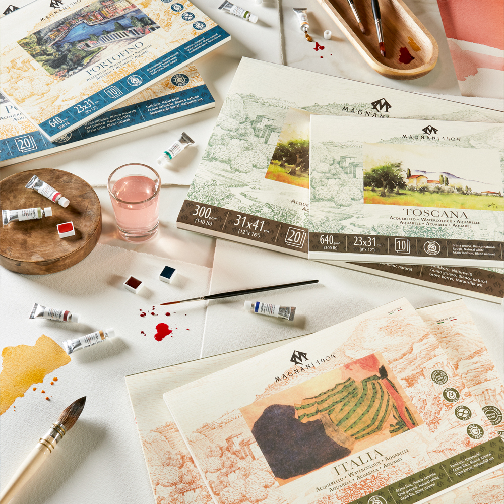 Kvalitetspapir til våte teknikker som akvarell. Laget på sylinderformmaskiner av 100% bomullsfibre i høy kvalitet. Tilgjengelige i tre ulike strukturer: kaldpresset (Italia), varmpresset (Portofino) og grov (Toscana). Den doble limingen garanterer at papiret har utmerket absorberingsevne og tillater gjentatte lag og lasurer, samt flere påføringer med vann.