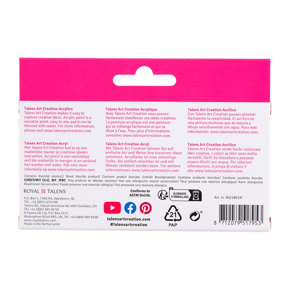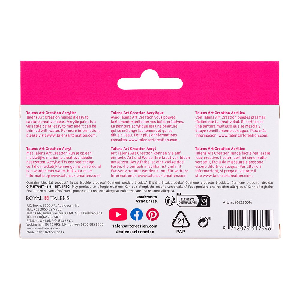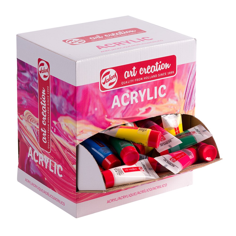 Talens Art Creation akrylfarge er tilgjengelig i 74 farger. Fargene er tilgjengelig i tuber med 75 ml og 200 ml og i bokser med 750 ml. Fargene er lette å blande og kan brukes på ulike underlag så lenge de er tilstrekkelig absorberende, støv fri og fettfri. De mest vanlige er selvfølgelig lerret og papir, men gips, tre, stein og sement er også gode underlag.