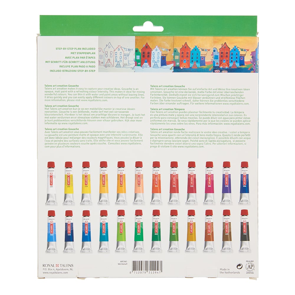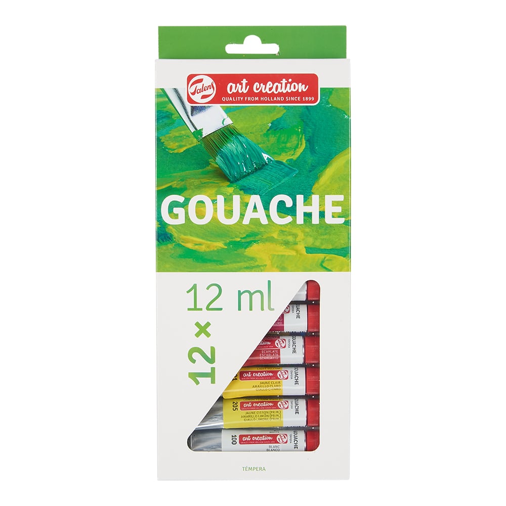 Gouache er en dekkende, matt maling på vannbasis. Kan brukes rett fra tuben eller tynnes ut med vann. Perfekt til jevne, matte felter som dekker helt uten striper. Kjent for sine rene, intense farger. Tørker på noen få minutter. Kan brukes på mange underlag som papir, kartong, lerret og tre. Leveres i fine start-sett med 12 ml tuber.