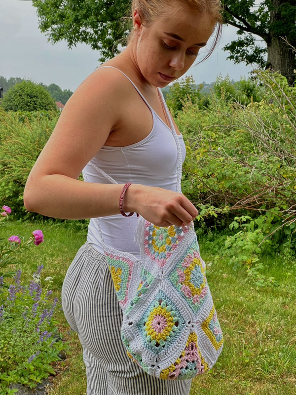 Denne vesken består av 13 ulike heklede bestemorsruter.