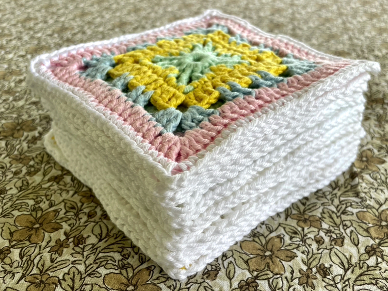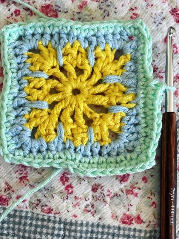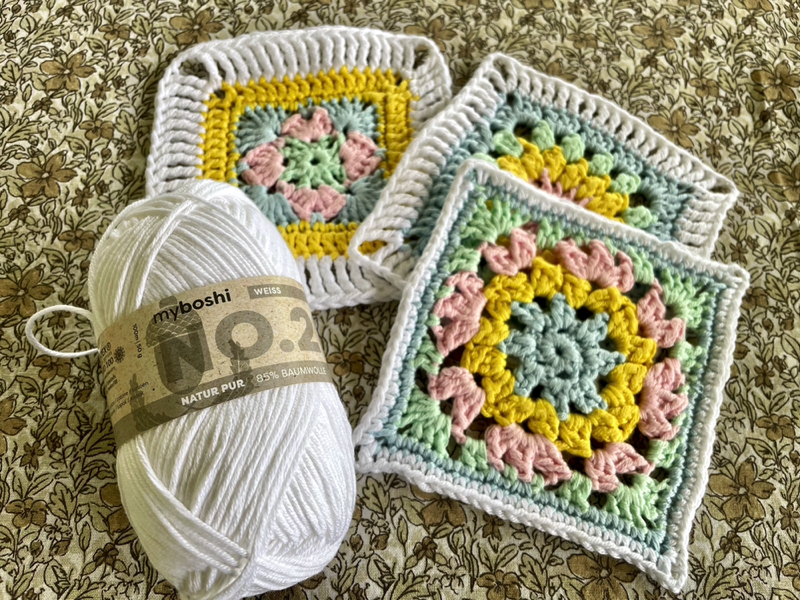 fargekombinasjon. Rundt alle rutene heklet jeg hvite kanter. Her ble det brukt forskjellige masker
