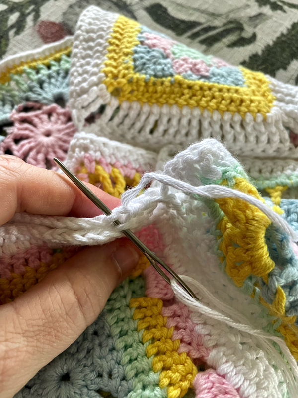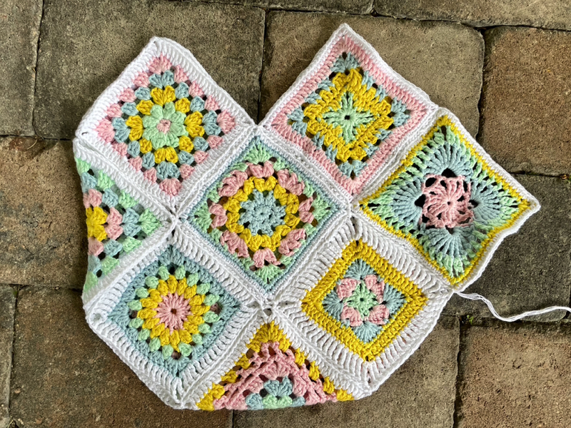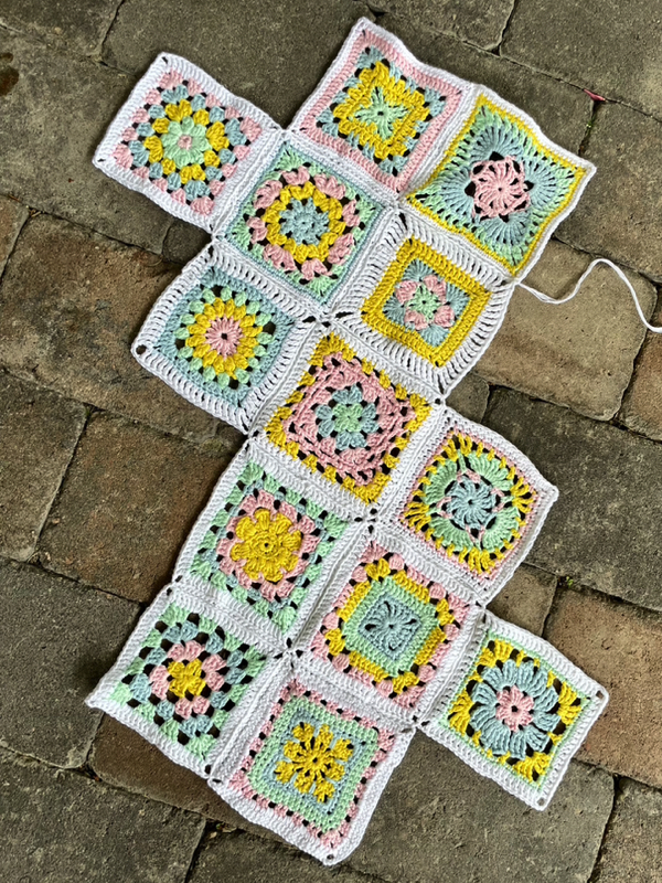 De heklede rutene ble så sydd sammen slik som bildet over viser. Når ferdig sydd brettes den slik