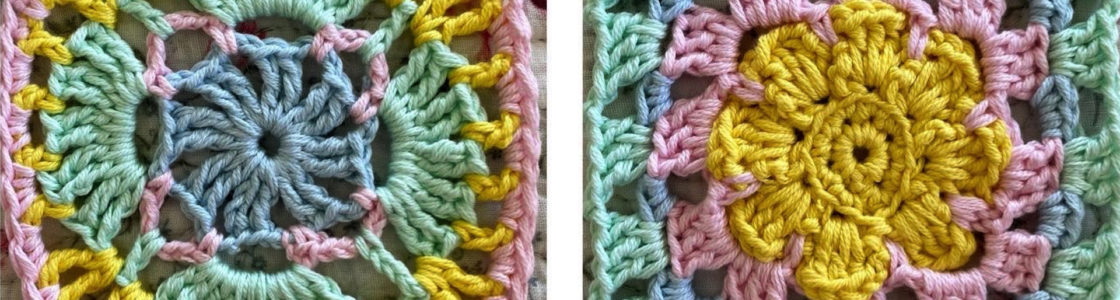 fargekombinasjon. Rundt alle rutene heklet jeg hvite kanter. Her ble det brukt forskjellige masker