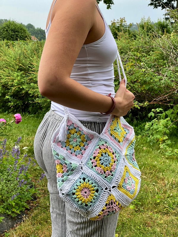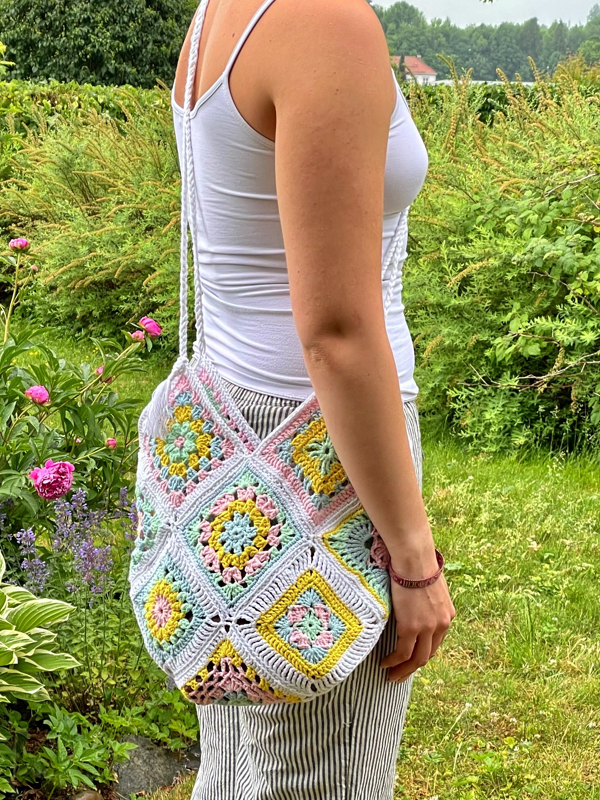 Denne vesken består av 13 ulike heklede bestemorsruter.