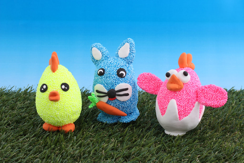 Vi laget påskekyllinger og påskeharer med isopor som base, både eggeformet og kjegleformet. Noen av kyllingene fikk fjær som ekstra pynt.