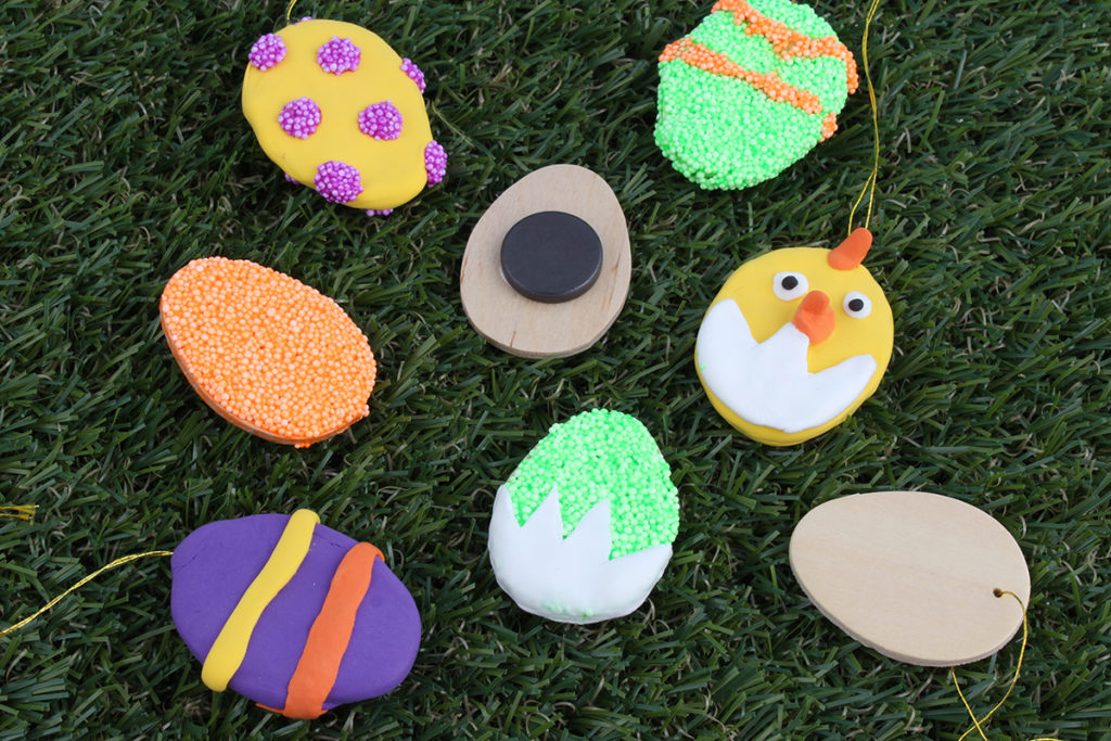 Leiren fester seg lett til andre materialer. Her har vi brukt egg i finér både med og uten oppheng. Vi har limt på magneter på de eggene uten oppheng, slik at man kan dekorere kjøleskapet med de.