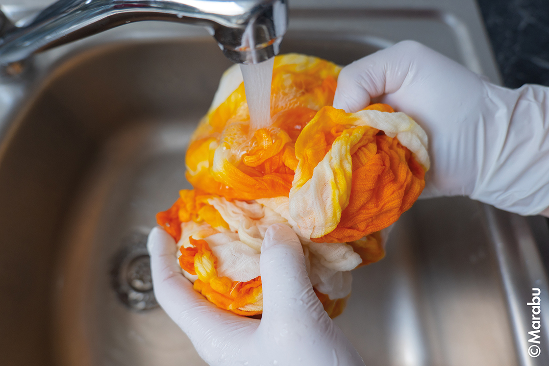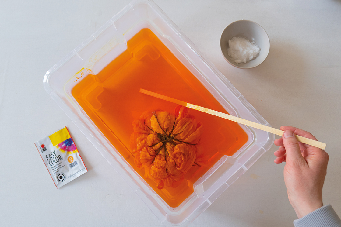 Hell så kokende vann i den store baljen og tilsett Easy Color og litt salt. Mengdeforholdet bør overholdes: For en intens farging av 150g stoff, bruk ca. 3-5 liter vann. For hver liter vann skal det tilsettes 1 ss salt. Den knyttede kimonoen fuktes litt først og legges deretter i fargebadet. Stoffet skal ligge i fargebadet i min. 20 minutter og bør flyttes på hele tiden.