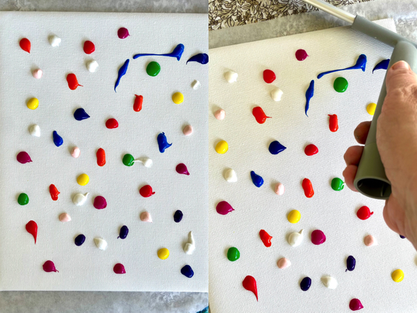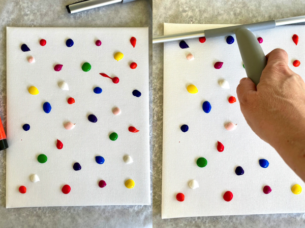 Start med å legge dråper av maling på maleplaten i et mønster og med farger du liker.